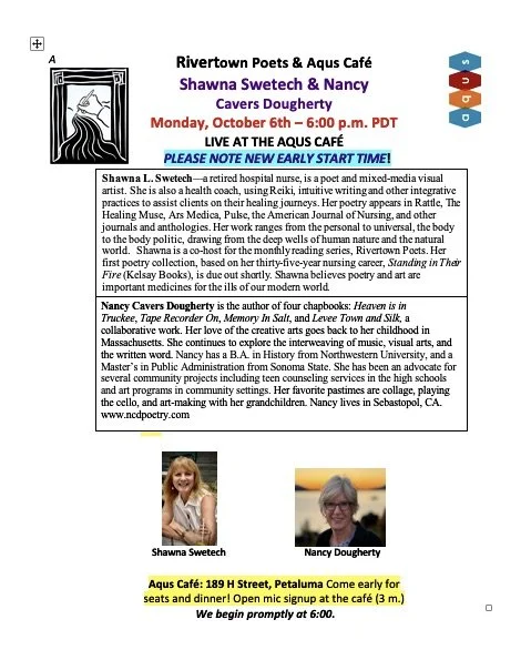 Our next reading will be LIVE and in person at our forever home, the Aqus Cafe in Petaluma (189 H Street) on October 6th at 6pm. We are excited to feature Nancy Dougherty from Sebastopol and our very own Rivertown co host poet Shawna Swertech, who will read from her soon to be published poetry collection. I promise you a wonderful evening of poetry and community.